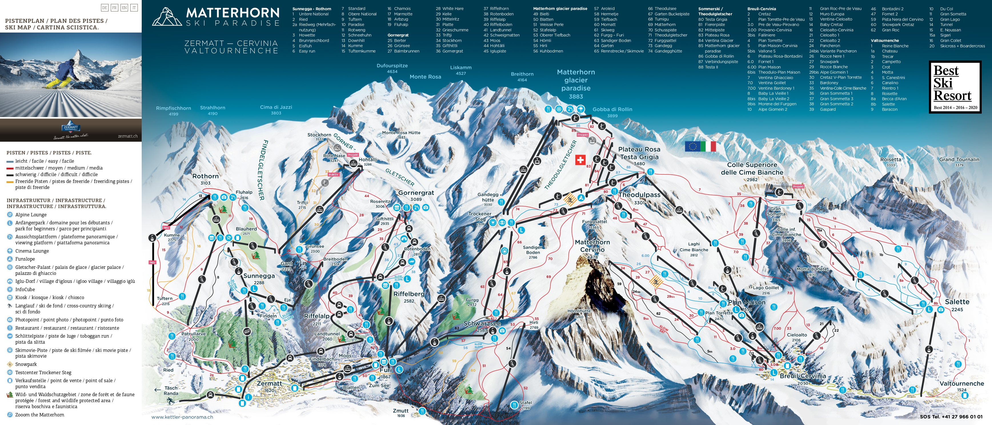 Mezinárodní jízdenky platné na všech lanovkách Cervino S.p.A. a všech lanovkách v Zermattu (Zermatt Bergbahnen AG a GGB Gornegrat-Monte Rosa-Bahnen). Mezinárodní jízdenky prodané v Itálii nelze použít pro odjezdy ze Švýcarska na začátku dne; pokud chcete přenocovat v Zermattu, informujte se prosím na pokladně.