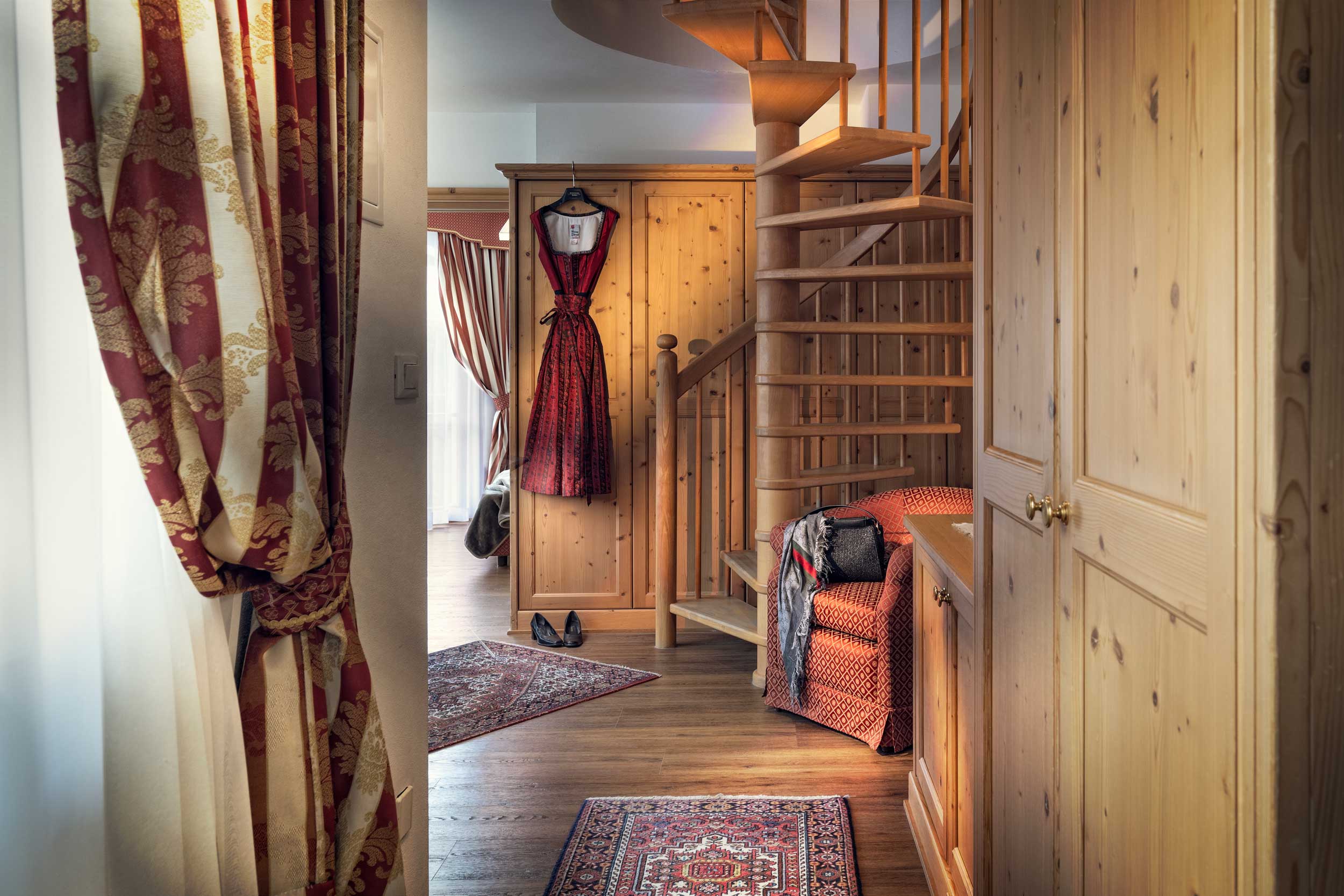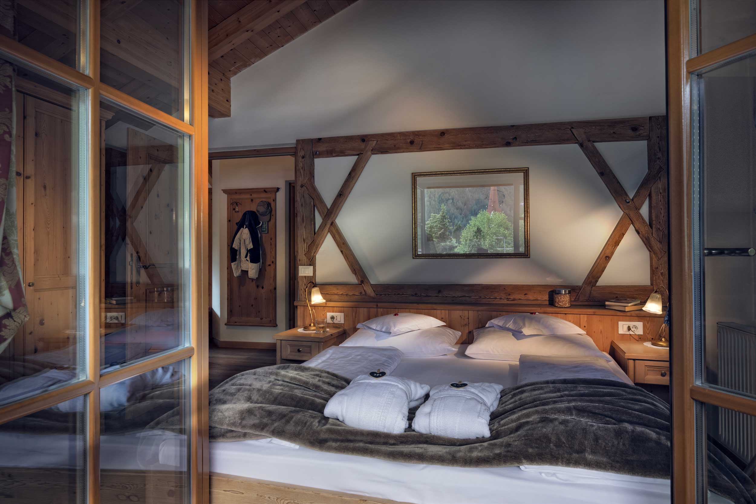 - pokoje Suita Zirben-Kristall - 2 - 4 osoby | exkluzivní juniorská suita z borovicového dřeva, křišťálů a žuly pro pobyt s vůní hor, ve znamení alpského wellness, s koupelnou s vanou a sprchou, další malou samostatnou koupelnou, SAT-TV, trezorem, fénem, minibarem, telefonem, WIFI připojením a panoramatickou terasou s výhledem na řeku a hory na jižní straně, domácí mazlíčci nejsou v tomto pokoji akceptováni. 35m2